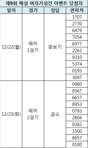 [이벤트 당첨 공지] 제9회 해성 여자기성전 초성 퀴즈(페어)